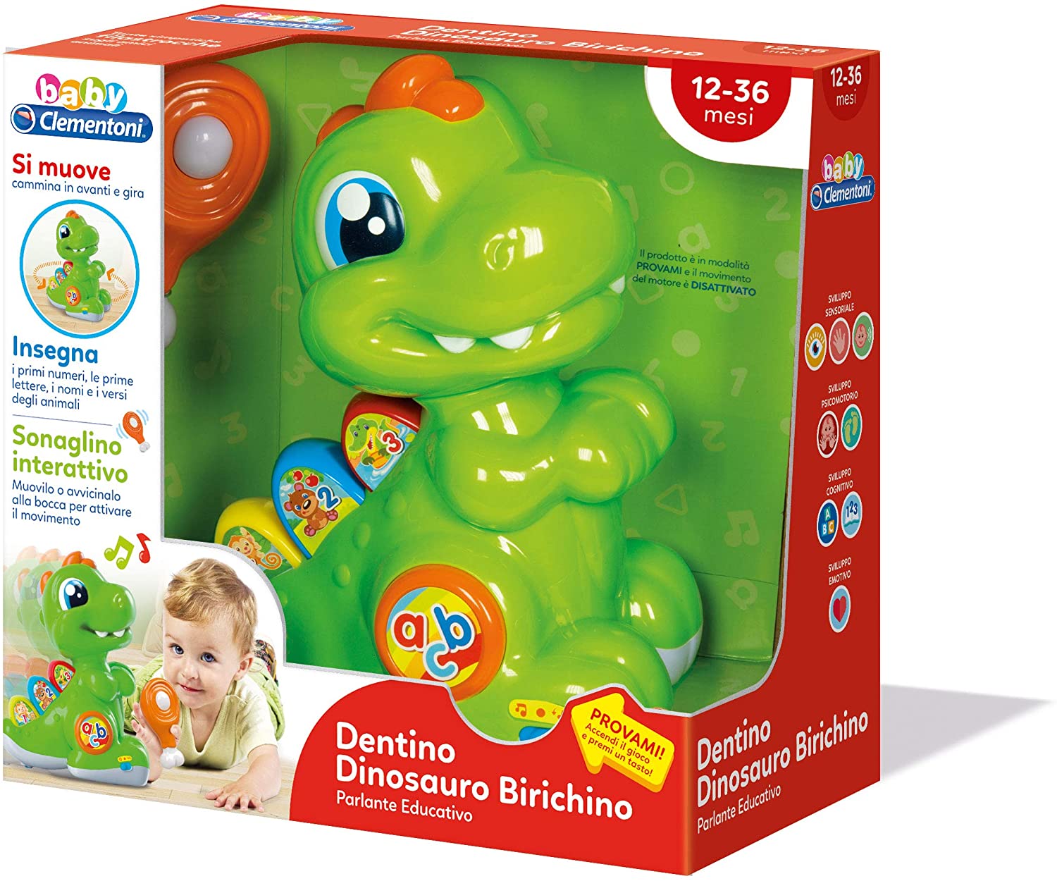 Dentino è un simatic cucciolo di dinosauro parlante insegna i primi numeri, le lettere, i versi degli animali il baby T-Rex riconosce quando il sonaglino a forma di osso viene avvicinato al muso dai 12 mesi in su batterie incluse.